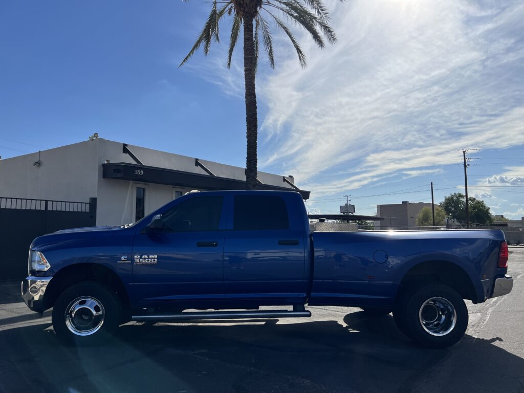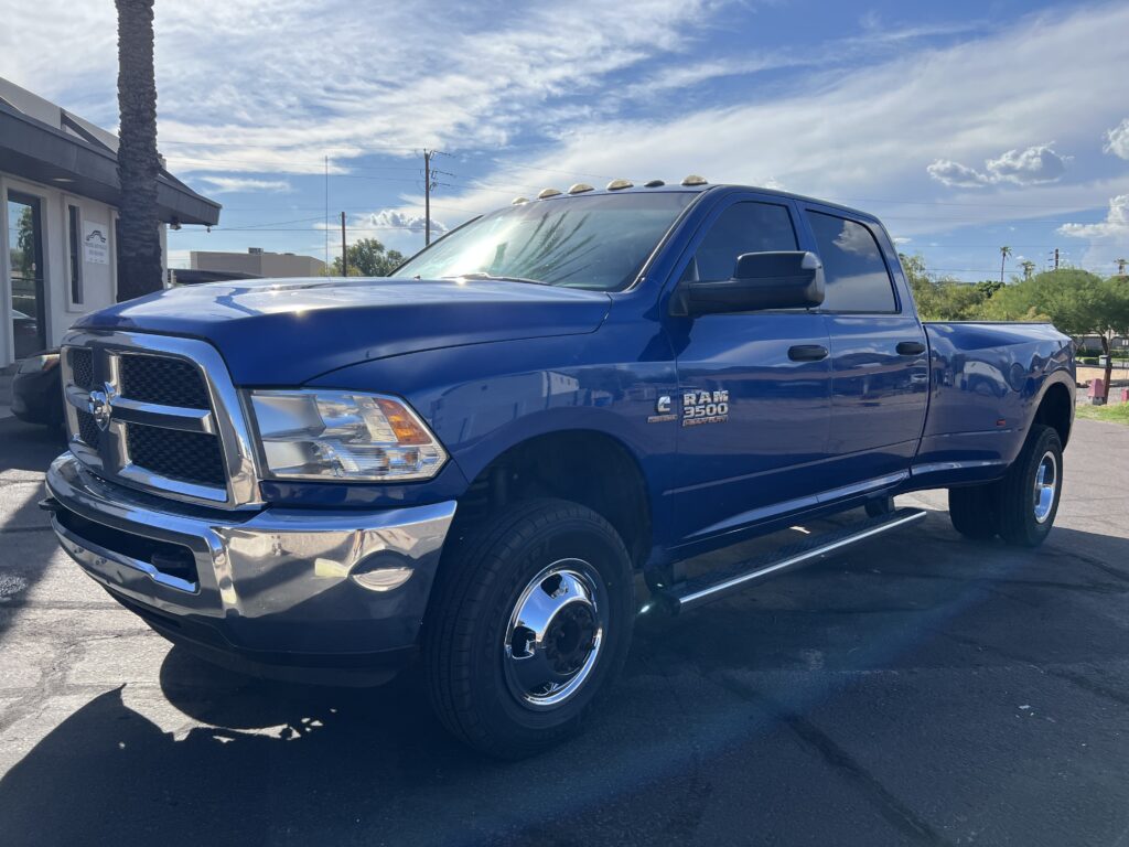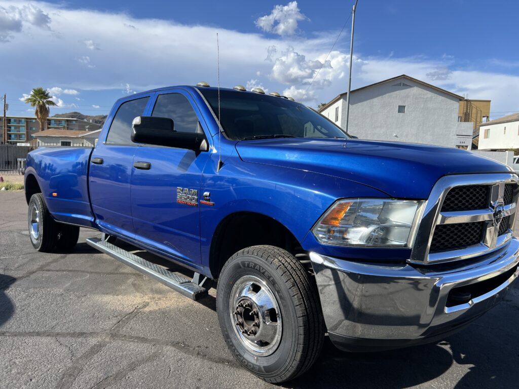 2018 Dodge Ram 3500, 4×4, Dually, 6.7 Cummins Diesel, Deleted, gorgeous Blue w black cloth, power windows, locks, tilt, cruise, factory tow package, factory brake controller, with Gooseneck 5th wheel ball and bumper hitches.